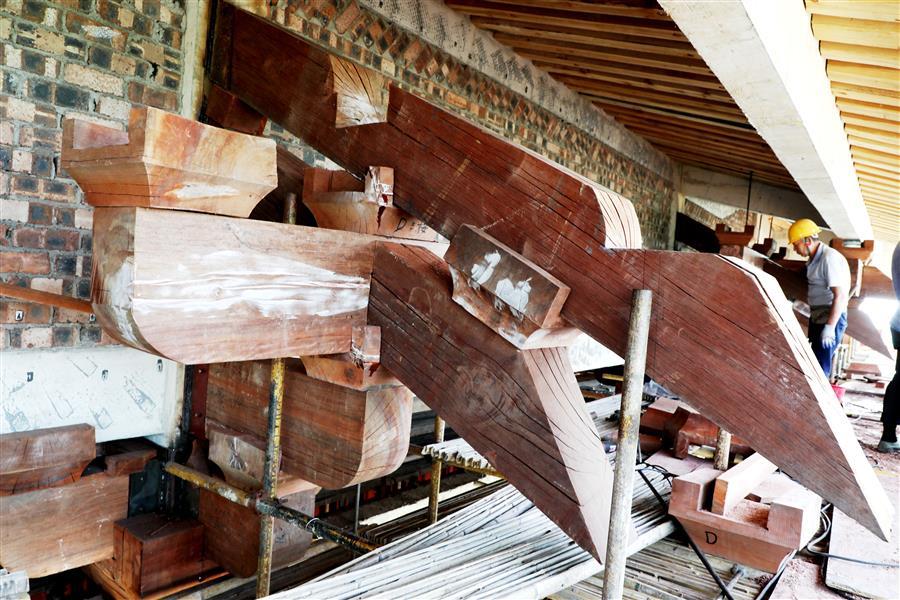 連日來(lái),在該項(xiàng)目湖心閣斗栱安裝現(xiàn)場(chǎng),每天有20多名經(jīng)驗(yàn)豐富的木工師傅在認(rèn)真進(jìn)行斗栱安裝作業(yè)。為保證項(xiàng)目質(zhì)量,解決項(xiàng)目斗栱安裝難題,加快安裝速度,項(xiàng)目部結(jié)合實(shí)際,通過(guò)多次試驗(yàn)和優(yōu)化設(shè)計(jì),確保柱子能承受斗栱重量,采用正裝方式進(jìn)行安裝,保證了安裝速度和安裝質(zhì)量。面對(duì)項(xiàng)目選用的木制斗栱材料密度大、重量重、安裝作業(yè)工作面窄等困難,木工師傅結(jié)合自身多年的木工經(jīng)驗(yàn),克服現(xiàn)場(chǎng)施工遇到的困難,相互配合,目前已完成斗栱安裝工作量的三分之一。
