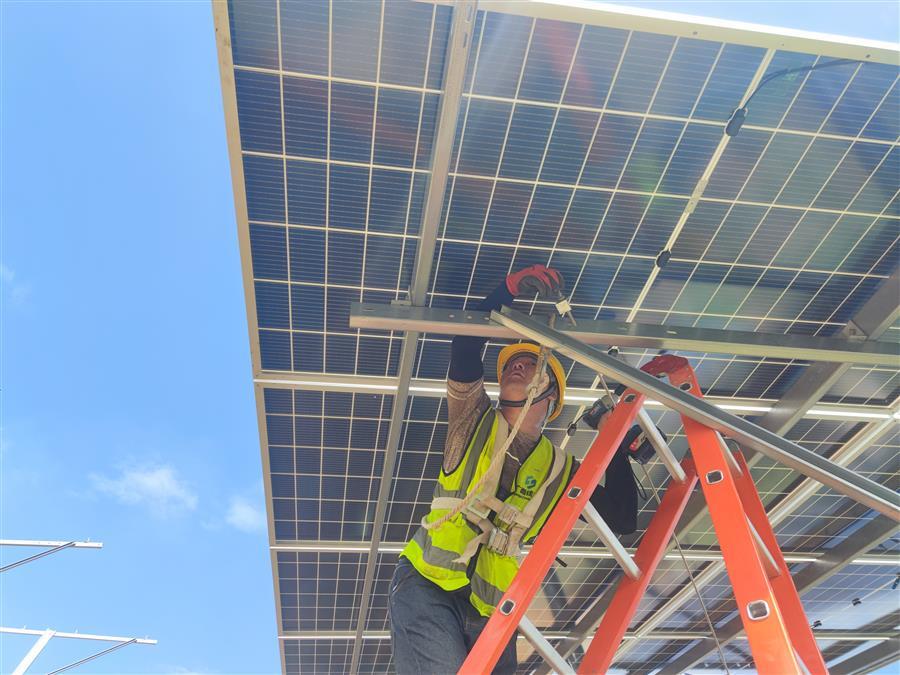 “我們戰(zhàn)高溫斗酷暑,搶工期、趕進度,確保如期實現(xiàn)并網(wǎng)發(fā)電?!币苯ɑA(chǔ)分公司寧明縣寨安光伏項目建設(shè)工程項目負(fù)責(zé)人李世文說,施工現(xiàn)場在山坡上,遮陽的地方少,光伏板和支架被太陽炙烤得發(fā)燙,施工人員咬緊牙關(guān)克服困難,堅守在工作一線。每天150余名施工人員輪流作業(yè),15臺機械設(shè)備晝夜運轉(zhuǎn),1500多畝的項目現(xiàn)場,一根根樁基豎起、一座座支架矗立,山坡上遍布光伏板。