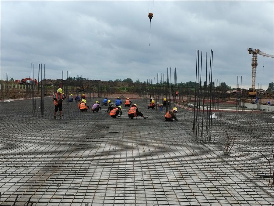 “日均投入施工技術(shù)人員500余人、各類(lèi)機(jī)械設(shè)備45臺(tái)搶抓施工節(jié)點(diǎn)?!表?xiàng)目負(fù)責(zé)人禤旭云說(shuō),自6月開(kāi)工以來(lái),針對(duì)項(xiàng)目工期緊、任務(wù)重的情況,項(xiàng)目部按照“開(kāi)工即攻堅(jiān)、起步即沖刺”的要求,全面推進(jìn)項(xiàng)目建設(shè)。目前,中試車(chē)間基礎(chǔ)回填、褥墊層鋪筑、墊層澆筑、剛性地面鋼筋綁扎完成;1#生產(chǎn)車(chē)間53~56軸獨(dú)基開(kāi)挖基礎(chǔ)承臺(tái)鋼筋綁扎、模板安裝、砼澆筑完成,48~52軸基礎(chǔ)開(kāi)挖、墊層澆筑完成;2#生產(chǎn)車(chē)間18~25軸基礎(chǔ)承臺(tái)鋼筋綁扎、模板安裝、砼澆筑完成;倉(cāng)庫(kù)基礎(chǔ)梁全部完成。