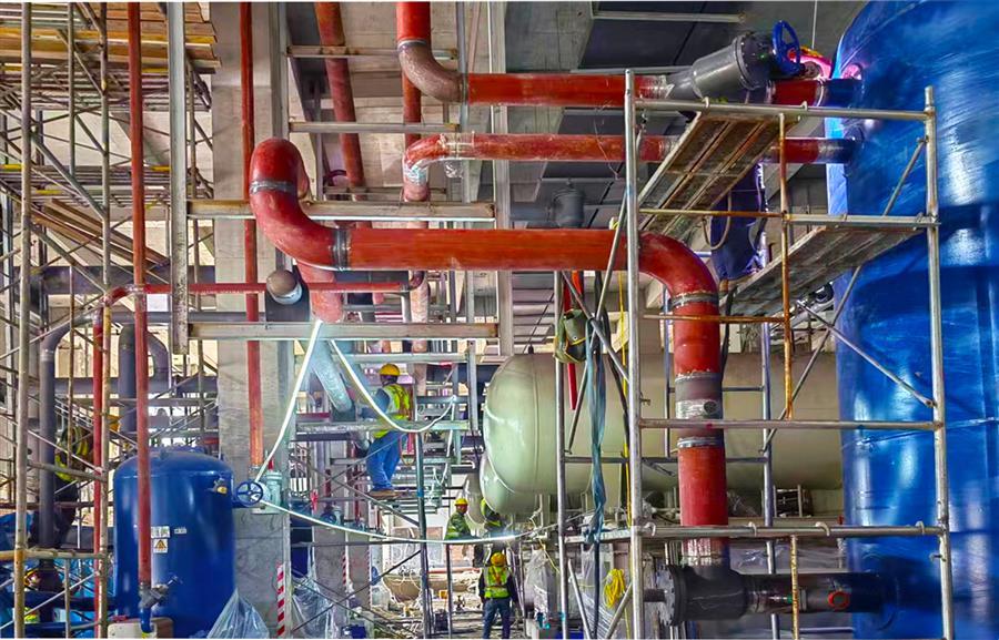 7月以來(lái),項(xiàng)目部精心組織,細(xì)化項(xiàng)目施工任務(wù),抓住施工“黃金期”加快推進(jìn)項(xiàng)目建設(shè)。項(xiàng)目全體人員頂著高溫酷暑,堅(jiān)守崗位,高標(biāo)準(zhǔn)、嚴(yán)要求,全力保障工程質(zhì)量和進(jìn)度,推動(dòng)項(xiàng)目建設(shè)順利有序進(jìn)行。目前,項(xiàng)目1#玉米加工車間屋面蒸發(fā)冷設(shè)備安裝完成,管道安裝完成90%;壓縮機(jī)、桶泵機(jī)組設(shè)備完成安裝,管道安裝完成50%、速凍機(jī)組設(shè)備安裝完成40%;3#配送中心機(jī)房屋面蒸發(fā)冷安裝完成及管道安裝完成80%;4#冷鏈配送中心室內(nèi)設(shè)備及管道安裝完成90%。