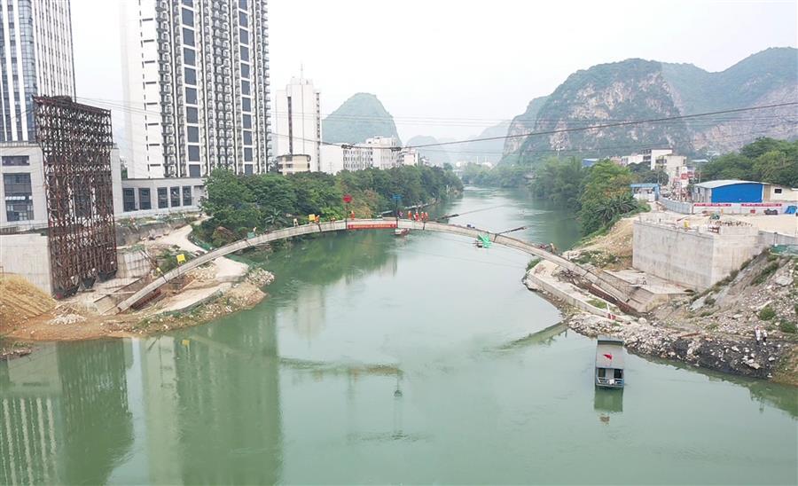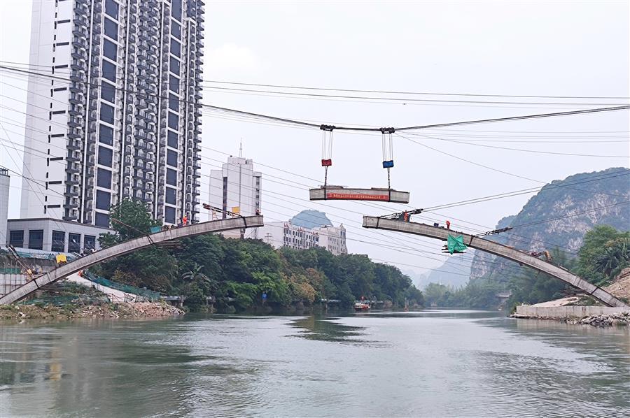 8:28分,隨著現(xiàn)場指揮員一聲口令,首條拱肋最后一節(jié)砼拱箱被纜索吊緩緩吊起,向橫跨在龍江河上的主拱圈移動。25分鐘后,第七片拱箱精準吊裝就位,河池市龍江六橋(輝樂橋)首條拱肋順利合攏。