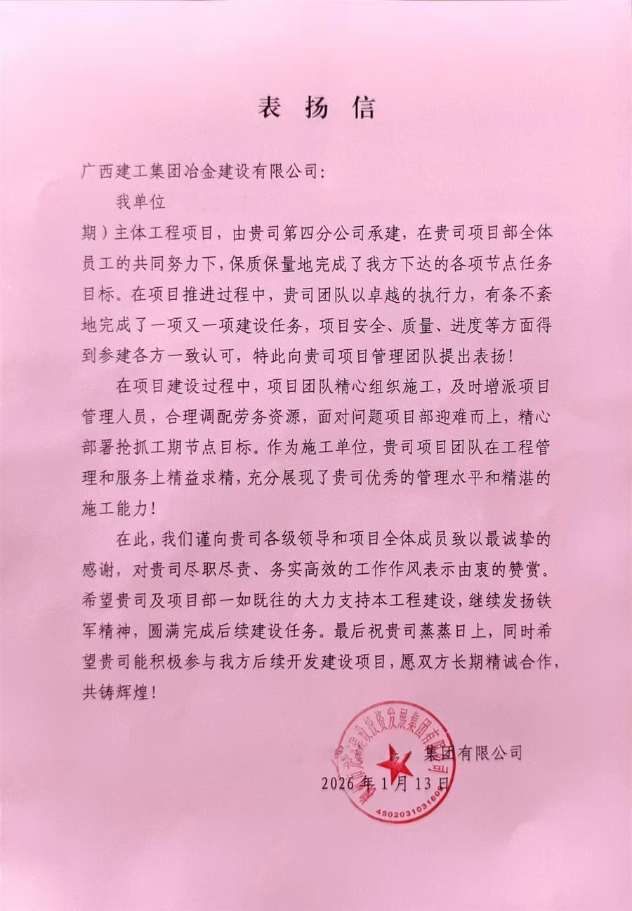 近日,冶建公司第四分公司憑借出色履約表現(xiàn),收到業(yè)主單位發(fā)來表揚(yáng)信。